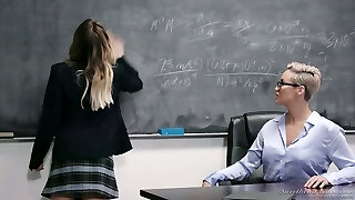 Lez teen anally toyed in classroom by busty Cougar teacher